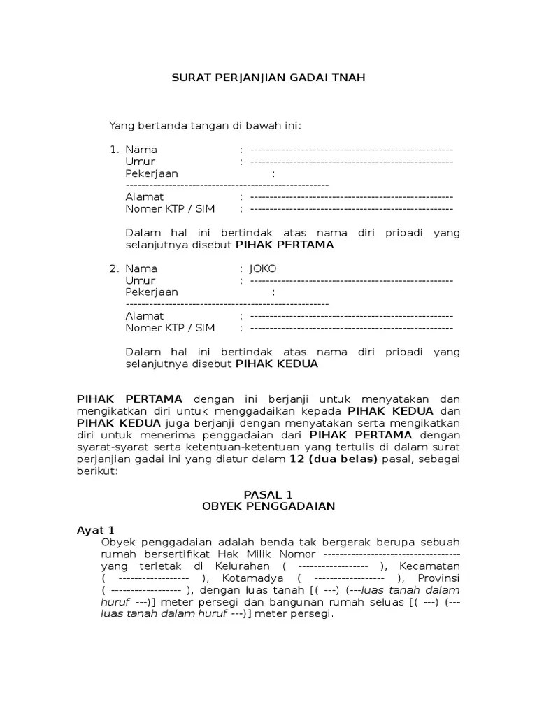 Bahwa kedua belah pihak telah bersepakat bahwa perjanjian gadai tanah antara . Pasal 6 nilai gadai kedua belah pihak telah sepakat pada nilai gadai rumah. Ada beberapa asset yang sangat sering dijadikan jaminan seperti motor, mobil, tanah, sawah, rumah, kontrakan, . Apabia anda bingung dalam mebuat surat gadai, anda bisa melihat artikel ini yang akan membahaskan contoh surat perjanjian gadai tanah. Contoh surat perjanjian sewa beli tanah yang bertanda tangan di bawah ini:
